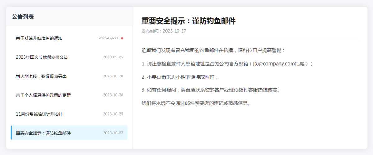 该样式采用了左右分栏的布局设计。左侧是 “公告列表”,以列表形式呈现多条公告条目,包含公告标题与发布时间,方便用户快速浏览和查找不同公告;右侧则是选中公告的详细内容展示区域,清晰呈现公告的具体信息,整体布局简洁明了,层次分明,能让用户高效获取公告相关内容。
