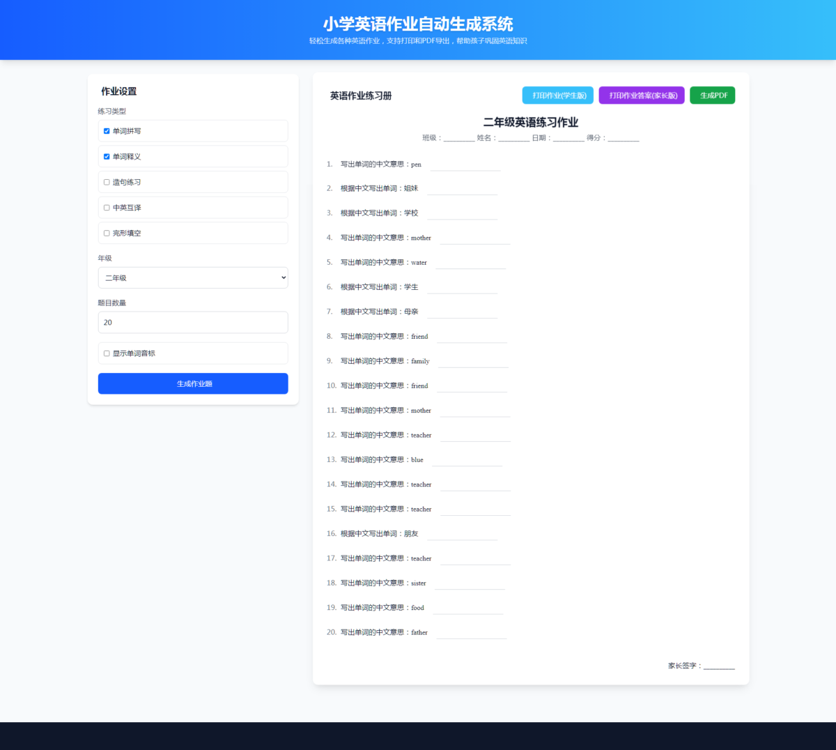 这款专注于小学英语作业的出题网站,界面简洁易用,支持随机生成多种英语练习题目,包含单词、句型等练习类型,并支持打印功能,底部已添加指定的版权信息和防篡改措施。