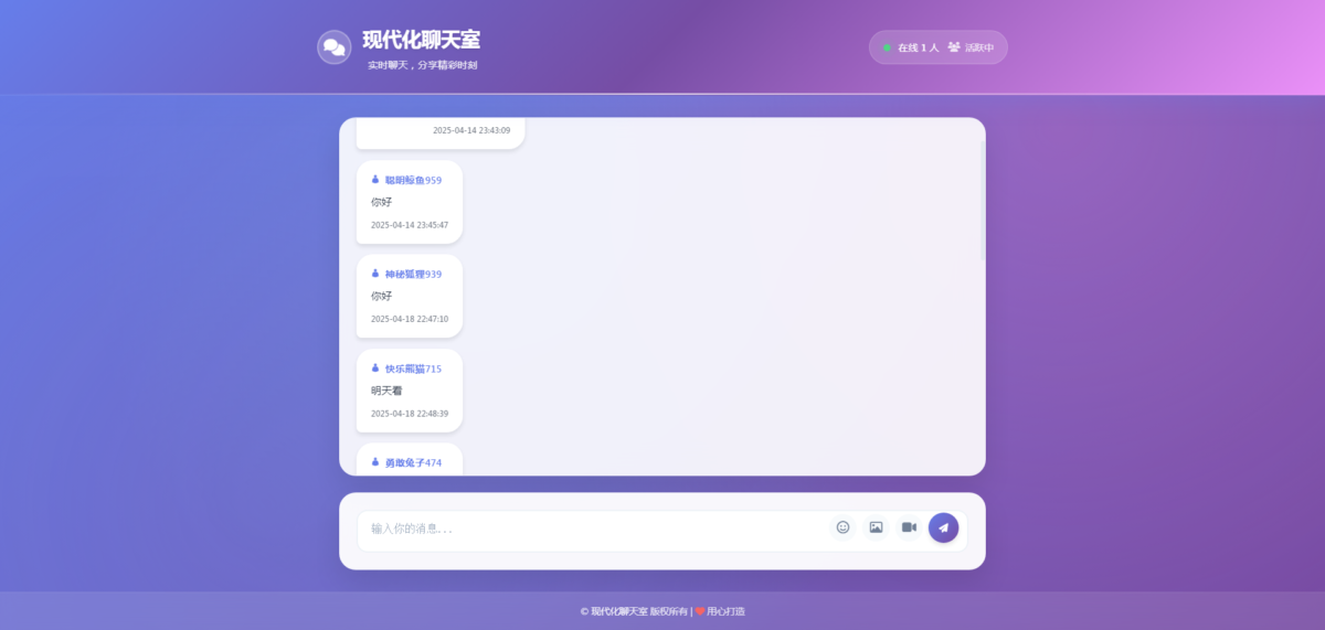 这是一款一款在线多人实时聊天室系统,支持表情包、图片、视频发送,支持每次发送消息随机用户名,无需数据库,无后台,简单的测试了,喜欢的自行部署吧!