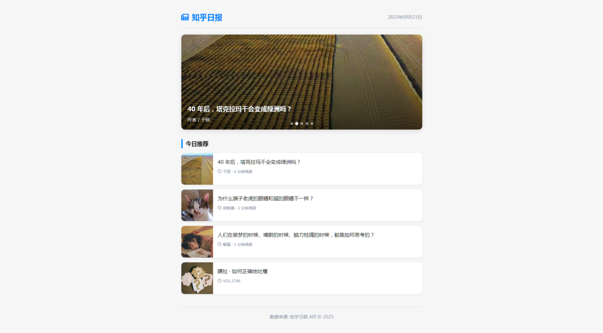 这是一款具有现代化界面和丰富交互功能的网页应用。主要特点包括响应式设计,可完美适配桌面和移动设备;顶部banner支持每5秒自动轮播;卡片元素具备悬停效果和点击跳转功能;提供优雅的加载状态提示和错误处理机制;通过阴影、圆角和过渡动画打造现代化UI体验,显著提升用户视觉感受。